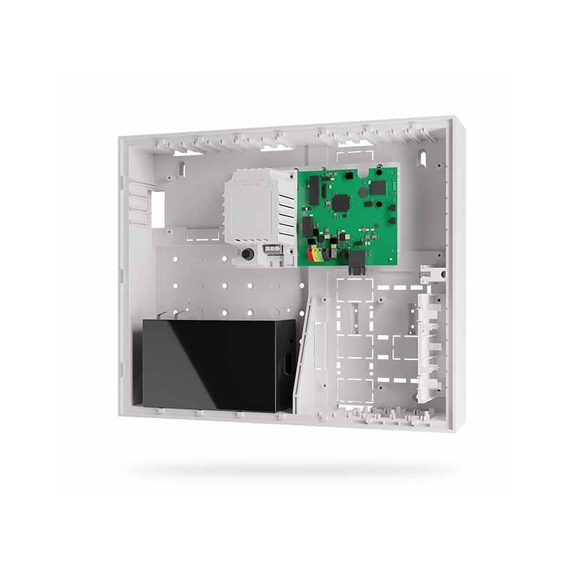 Alarmzentrale der Serie JA-100+ mit vergrößertem Gehäuse, das einen 18Ah-Akku aufnehmen kann.